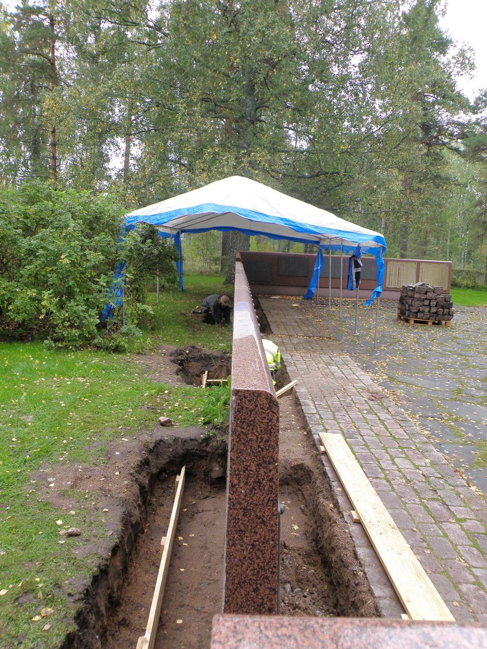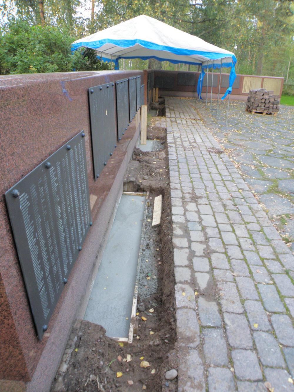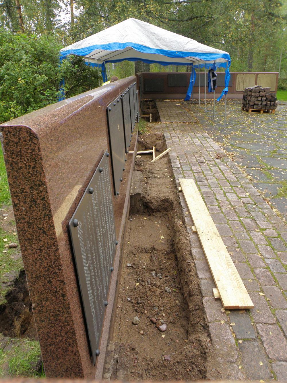 2013 märktes att sockeln till till granitväggen i minnesmärkets utvidgningsdel hade fått sprickor. Det var en följd av att marken hade satt sig vid linjegravarna. Därför var man tvungen att åtgärda de uppkomna skadorna. Arbetet som var både nödvändigt och krävande, krävande med tanke på att det var en gravplats, gjordes av en entrepenör som hade erfarenhet av liknande uppdrag åt församlingar. Arbetet tog knappt två veckor under den tiden var minnesmärket delvis avstängt.